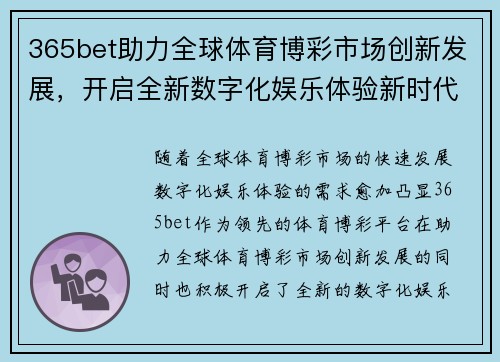 随着全球体育博彩市场的快速发展,数字化娱乐体验的需求愈加凸显。365bet作为领先的体育博彩平台,在助力全球体育博彩市场创新发展的同时,也积极开启了全新的数字化娱乐体验新时代。本文将从四个方面详细阐述365bet如何在全球范围内推动体育博彩行业的创新和数字化转型,探索它如何为全球用户带来更加丰富、便捷和安全的娱乐体验。四个主要方面包括:智能化平台的建设与发展、创新的用户体验提升、数字化支付方式的安全与便捷、以及区块链技术的应用与前景展望。通过深入分析这几个方面,本文力求展现365bet在数字化时代如何与全球体育博彩市场共同成长,推动行业走向更高水平。
