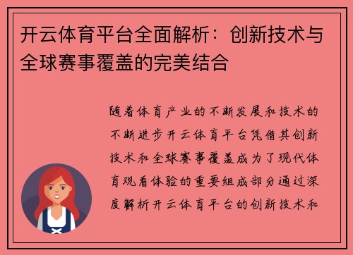 随着体育产业的不断发展和技术的不断进步,开云体育平台凭借其创新技术和全球赛事覆盖,成为了现代体育观看体验的重要组成部分。通过深度解析开云体育平台的创新技术和全球赛事覆盖的完美结合,我们可以更好地理解这一平台如何为用户提供全方位的体育娱乐体验。本文将从四个方面详细阐述开云体育平台的独特优势,分别是平台的创新技术、全球赛事的覆盖范围、用户体验的优化以及平台对未来体育行业的影响。通过这些方面的深入分析,我们将全面了解开云体育平台如何在激烈的市场竞争中脱颖而出,并为全球用户提供优质的体育内容。