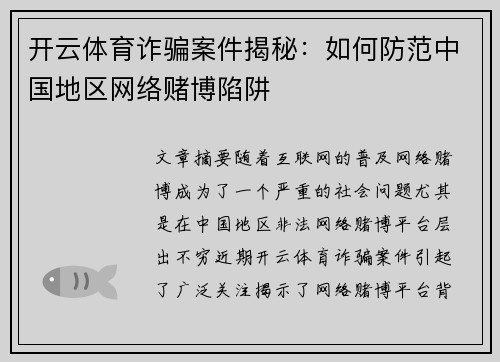 随着互联网的普及,网络赌博成为了一个严重的社会问题,尤其是在中国地区,非法网络赌博平台层出不穷。近期,开云体育诈骗案件引起了广泛关注,揭示了网络赌博平台背后的黑色产业链。本篇文章将从四个方面深入分析开云体育诈骗案件,并提供实用的防范策略,帮助公众识别并避免类似的网络赌博陷阱。首先,我们将探讨开云体育平台的运作模式及其如何通过虚假宣传吸引用户。接着,分析该平台如何利用漏洞和诈骗手段操控玩家资金,以及其如何利用非法渠道进行资金洗钱。最后,我们将提出如何有效防范此类网络赌博陷阱的具体措施,包括如何识别非法平台、加强网络安全意识、提升个人防范能力等。本文的目的是帮助中国地区的网民了解并规避网络赌博的风险,从而有效避免受害。