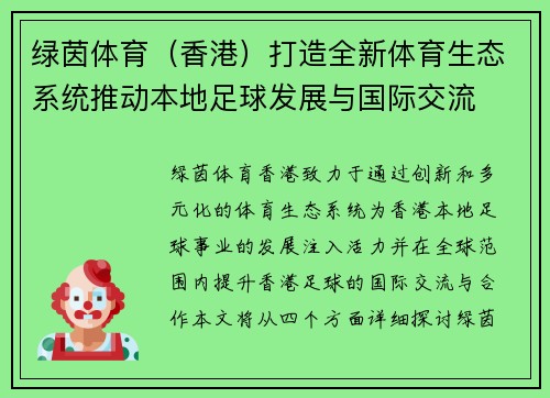 绿茵体育(香港)致力于通过创新和多元化的体育生态系统,为香港本地足球事业的发展注入活力,并在全球范围内提升香港足球的国际交流与合作。本文将从四个方面详细探讨绿茵体育(香港)如何构建全新的体育生态系统,推动本地足球的发展并促进国际间的体育合作。这四个方面分别包括:首先,绿茵体育(香港)如何通过基础设施建设与设施运营提升本地足球环境;其次,绿茵体育(香港)通过青训体系的完善培养足球人才,推动足球文化的普及;第三,绿茵体育(香港)如何通过国际赛事的引入与合作,促进香港与世界足球强国的交流与互动;最后,绿茵体育(香港)如何借助数字化技术及现代化管理创新推动香港足球行业的全面发展。在文章的结尾,将对绿茵体育(香港)打造全新体育生态系统的贡献做出总结,并展望未来香港足球的广阔前景。