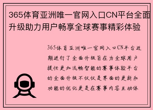 365体育亚洲唯一官网入口CN平台近期进行了全面升级,旨在为全球用户提供更加流畅、智能的赛事体验。平台的全面升级不仅仅是界面的更新和功能的优化,更是在赛事内容、互动体验、技术支持等方面进行了深度提升。这一系列的升级措施,将大大增强用户的参与感和观看体验,使他们能够更加便捷地享受全球各类精彩赛事。本文将从四个方面详细阐述365体育亚洲唯一官网入口CN平台如何通过全面升级助力用户畅享全球赛事精彩体验,具体包括平台性能提升、内容覆盖的丰富性、用户体验的优化以及技术保障的加强等方面。